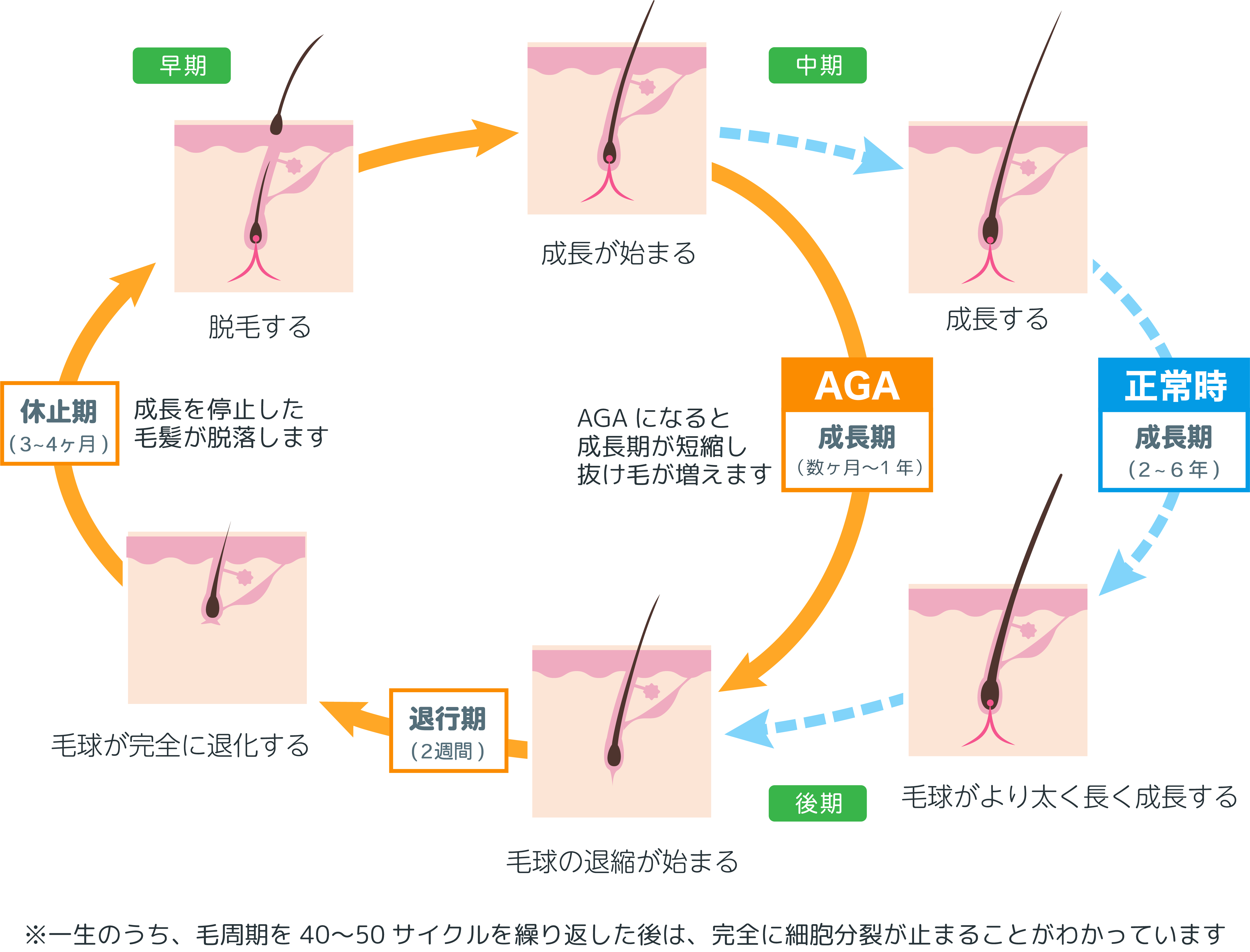 DHTが毛根にある「毛乳頭細胞」に作用すると、髪が成長する期間(成長期)が短くなります。その結果、髪が太く長く育つ前に抜けてしまい、細く弱い毛が増えていきます。これを「髪のミニチュア化」と呼び、ボリュームが減ったように見える原因になります。
