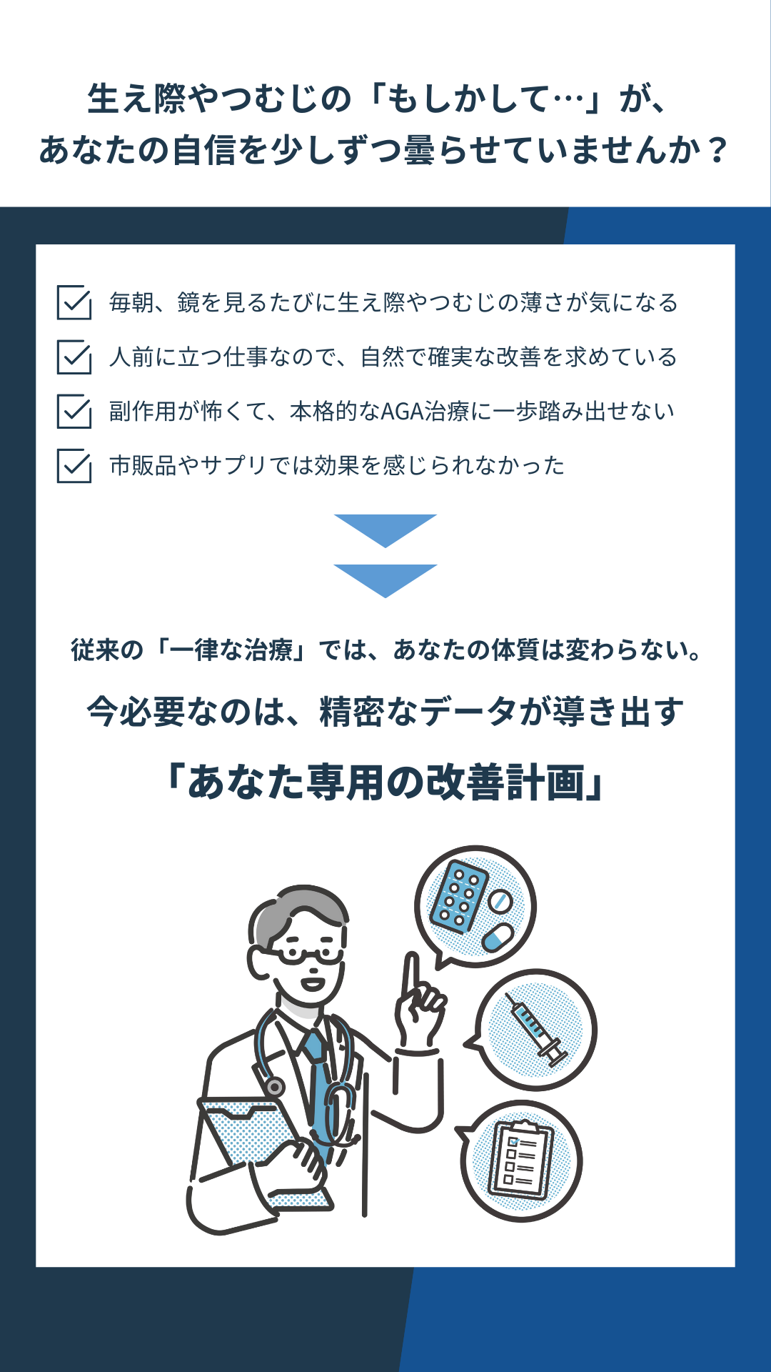 男性ホルモンの一種であるテストステロンは、体毛や筋肉を育てる働きがあります。ところが、頭皮にある酵素 「5αリダクターゼ」 と結びつくと、「DHT(ジヒドロテストステロン)」 という強い作用を持つホルモンに変わります。このDHTは「悪玉脱毛ホルモン」とも呼ばれ、髪の根元に影響を与え成長期が短縮されていることが報告されています。