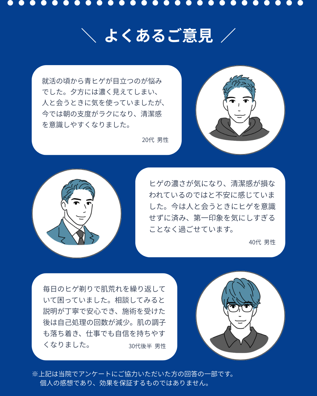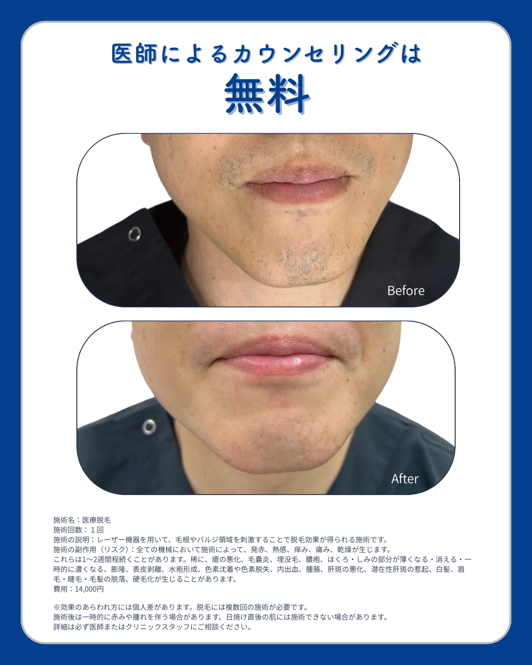 また、髭は毛周期(毛の生え変わりのサイクル)が早いため、1~2か月に1回のペースで通っていただくのが理想的です。