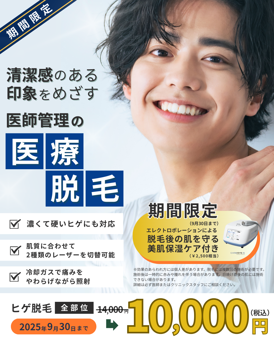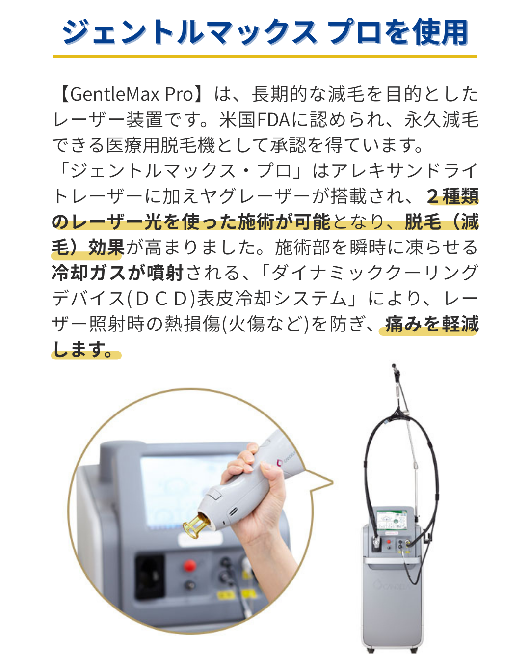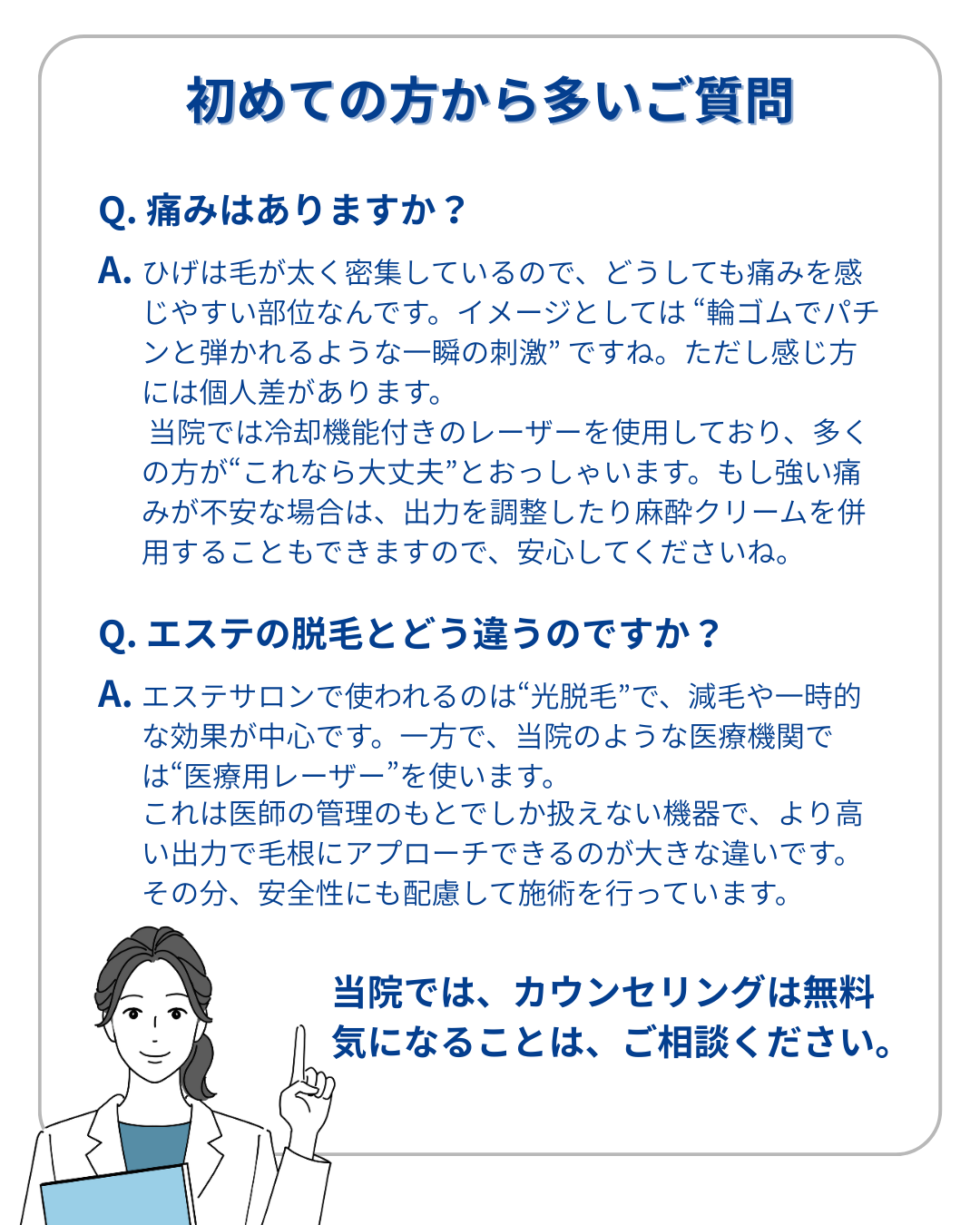 当院では冷却機能付きのレーザーを使用しており、多くの方が耐えられる程度です。もし痛みが強い場合は、出力の調整や麻酔クリームの併用も可能ですので、安心してご相談ください